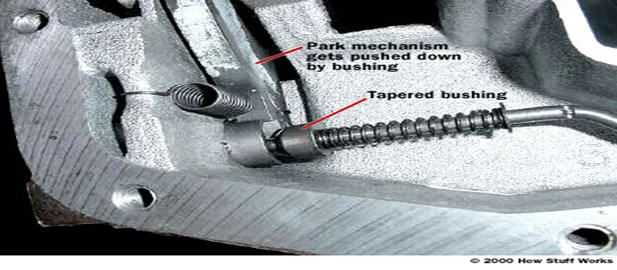 در شکل زیر شما برآمدگی مکانیسم پارک قفل را درداخل پوسته می ببینید ، جایی که دنده ها در داخل آن قرار گرفته است . به سمت مخروطی شکل آن توجه کنید . آن به آزاد شدن قفل پارک ، موقعی که شما در سربالایی پارک کرده اید کمک می کند . نیروی حاصل از وزن خودرو به بیرون آمدن ( فشار وارد می کند تا مکانیسم پارک قفل آزاد شود ) مکانیسم پارک قفل کمک می کند . به دلیل زاویه دار بودن مخروطی شکل .