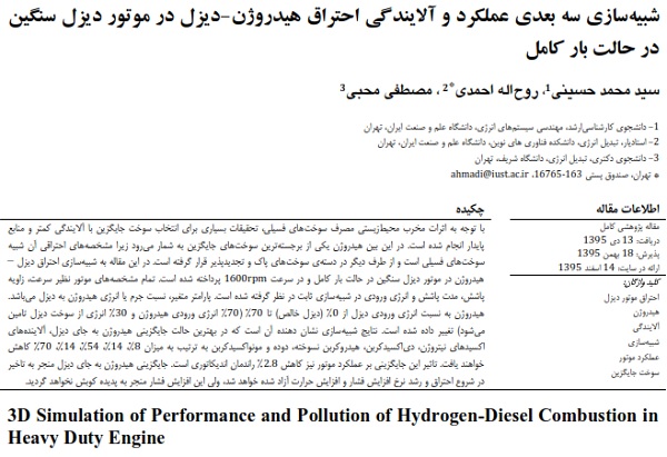 شبیه سازی 3بعدی عملکرد و آلایندگی احتراق هیدروژن-دیزل در موتور دیزل سنگین درحالت بار کامل